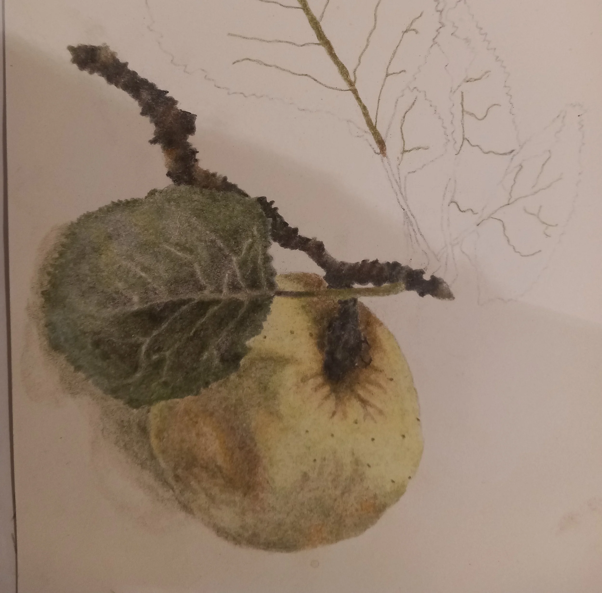 And the art tutor is right. I do need to slow down, notice all the different shades and textures within a cooking apple, stalk and leaves. Maybe I should do more to convey the same level of subtlety in my writing.